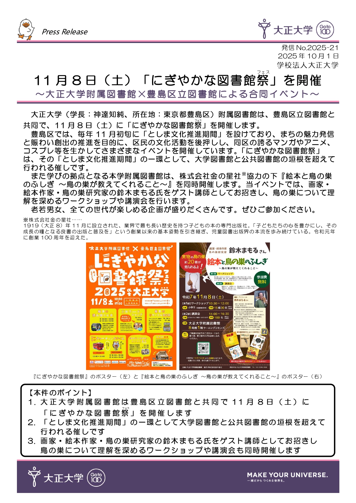 【プレスリリース】11月8日(土)「にぎやかな図書館祭(フェス)」を開催 ~大正大学附属図書館×豊島区立図書館による合同イベント~