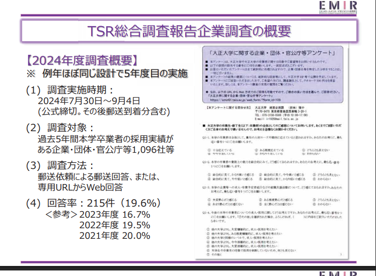 そして「就職に関する状況」について、本学卒業生の就職率や進路満足度の現状、さらに企業等を対象としたTSR総合調査を基に、社会から見た卒業生の評価について福島所長より報告がありました。就職満足度は概ね高い一方で、今後の社会的ニーズに対応する人材育成の必要性が示されました。
