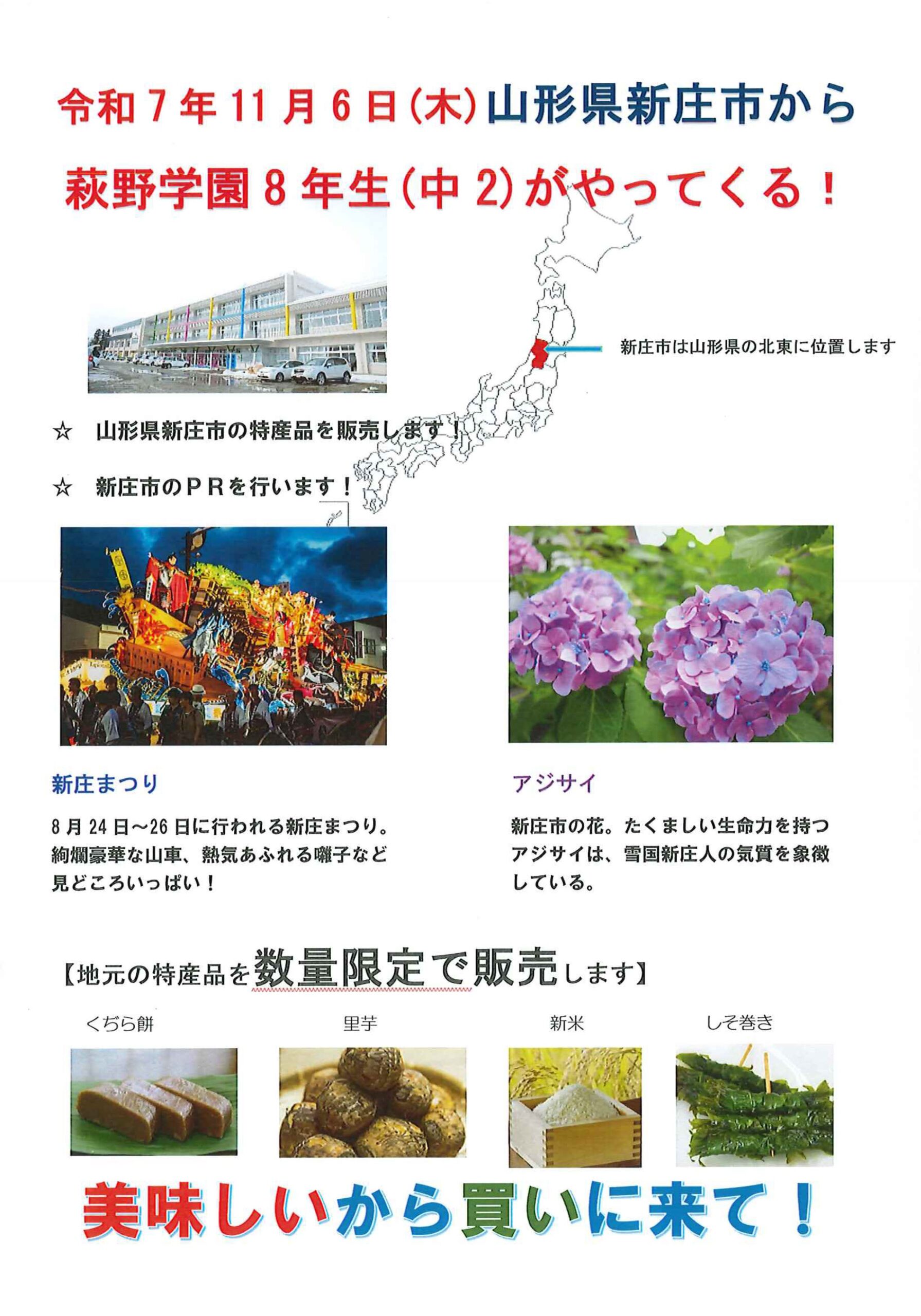 【お知らせ】本学正門前で山形県・新庄市立萩野学園の生徒が特産品の販売を行います