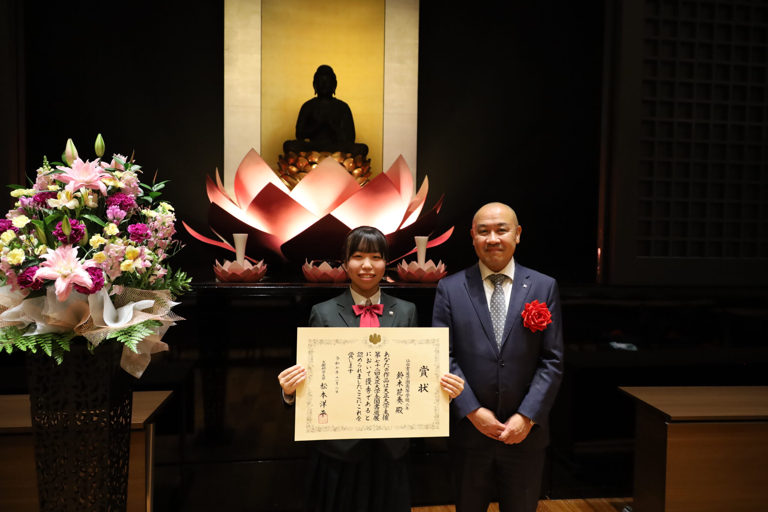 11月2日(日)に第72回大正大学全国書道展 表彰式を開催しました。 今年度は、全国の学生・書道団体から総数2,344点(条幅824点・半紙1,520点)の作品が出品がされ、特に優秀な作品に賞を授与しました。 ※第72回大正大学全国書道展入賞者一覧はこちらから 左:仙台育英学園高等学校 2年 鈴木花奏さん(文部科学大臣賞) 右:大正大学学長 神達知純 ■第72回大正大学全国書道展についてはこちらから