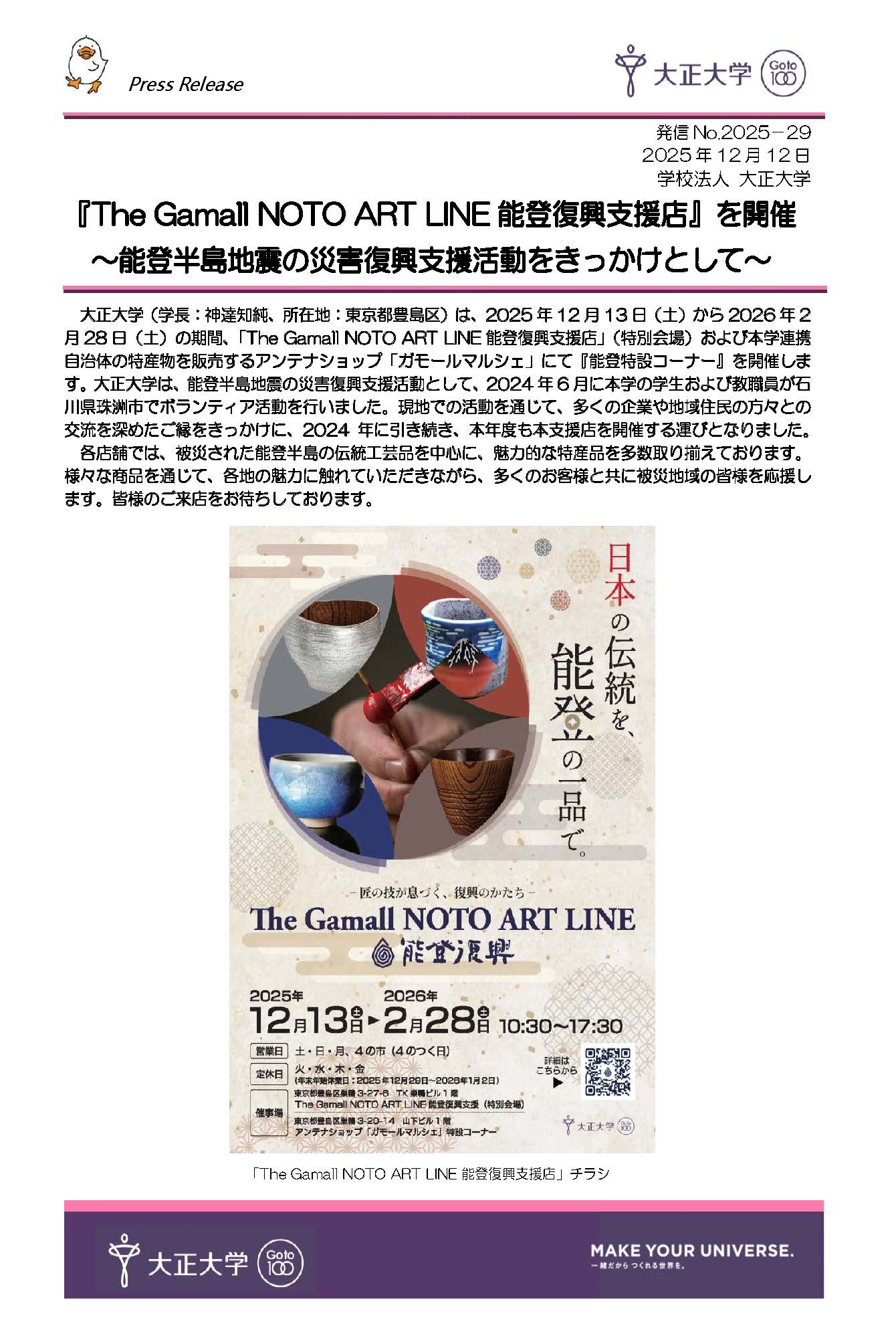 大正大学は、2025年12月13日(土)から2026年2月28日(土)の期間、「The Gamall NOTO ART LINE能登復興支援店」(特別会場)および本学連携自治体の特産物を販売するアンテナショップ「ガモールマルシェ」にて『能登特設コーナー』を開催します。大正大学は、能登半島地震の災害復興支援活動として、2024年6月に本学の学生および教職員が石川県珠洲市でボランティア活動を行いました。現地での活動を通じて、多くの企業や地域住民の方々との交流を深めたご縁をきっかけに、2024年に引き続き、本年度も本支援店を開催する運びとなりました。