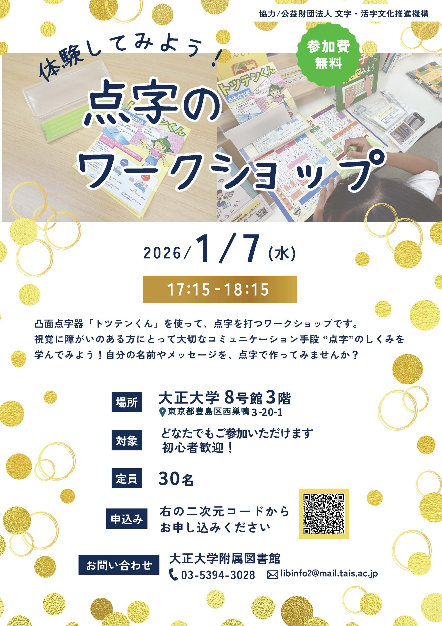 『点字のワークショップ』を1月7日(水)に大正大学附属図書館(8号館3階)で開催します。