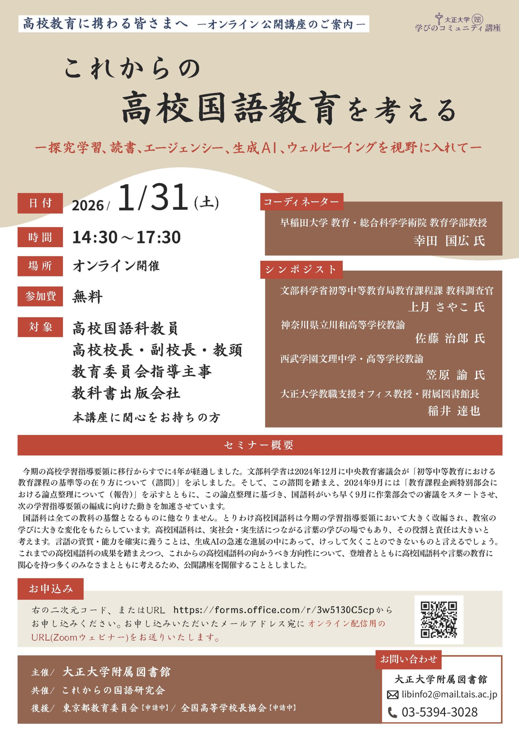 オンライン公開講座『これからの高校国語教育を考える-探究学習、読書、エージェンシー、生成AI、ウェルビーイングを視野に入れて-』を1月31日(土)に開催します。