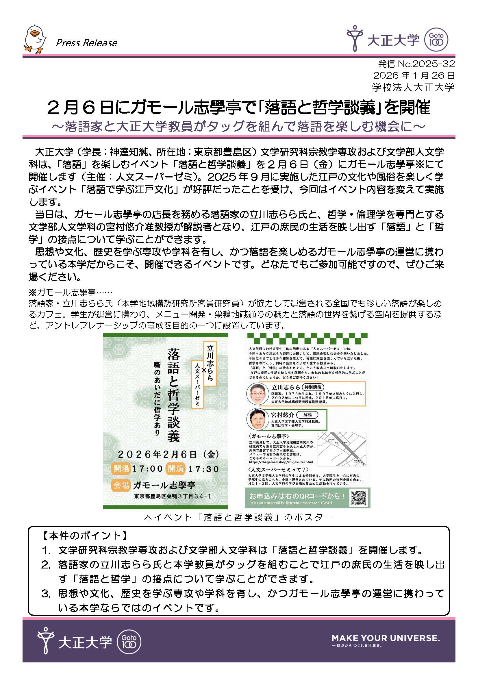 大正大学(学長:神達知純、所在地:東京都豊島区)文学研究科宗教学専攻および文学部人文学科は、「落語」を楽しむイベント「落語と哲学談義」を2月6日(金)にガモール志學亭※にて開催します(主催:人文スーパーゼミ)。2025年9月に実施した江戸の文化や風俗を楽しく学ぶイベント「落語で学ぶ江戸文化」が好評だったことを受け、今回はイベント内容を変えて実施します。
