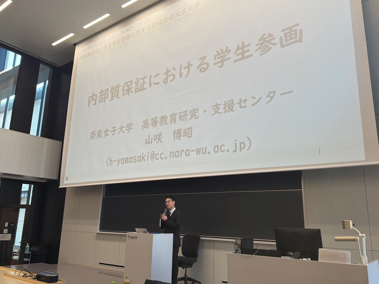 当日は、奈良女子大学高等教育研究・支援センター准教授の山咲博昭氏を講師に迎え、「内部質保証における学生参画」をテーマにご講演いただきました。講演では、認証評価制度の背景や求められる大学の内部質保証体制、学生参画の意義および他大学の先進的な取組事例について、具体的かつ実践的な示唆をご講演いただきました。