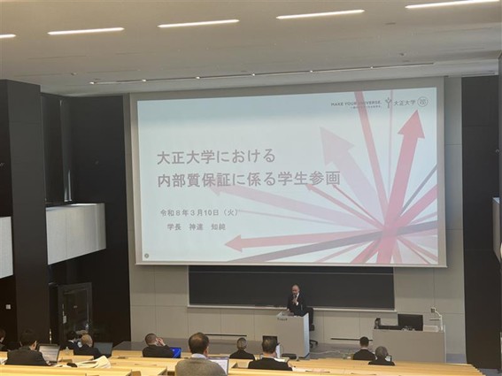また、本学の取組として、学長より「大正大学における内部質保証に係る学生参画」の現状と今後の方向性について学長より報告を行いました。