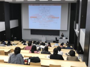 18時を過ぎた6限目にも関わらず、多くの学生が参加し講師の話にしっかりとメモを