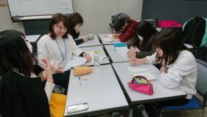最初に全体説明したあと、2グループに分かれて一人ひとり自己PR・学チカを書き上げていました。