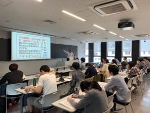 この講座は、前期では、企業とは何か?どう分類されどんな仕事があるのか?など、業種・業界・企業の基本を学び、夏休み前はインターンシップ参加に触れ、後期では業界毎の詳細な説明に進み、3年生最終時期に開催する「学内企業研究会」で主体的に企業選びができるようになることをゴールに設定しています。