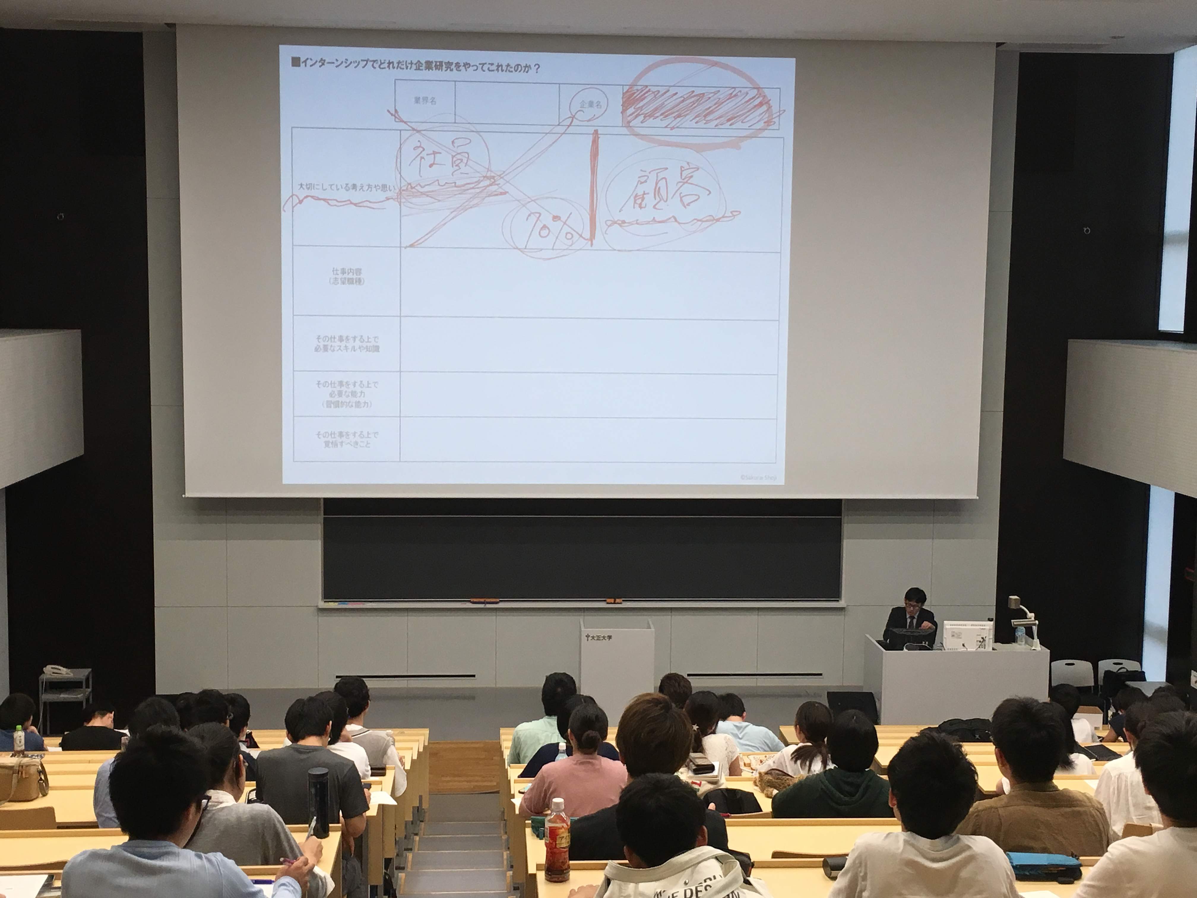 昨年度の回での満足度は98%、4年生の先輩からも高い人気を誇る株式会社ソーシャルデザイニング研究所の講師をお招きし「インターンシップの選び方と評価アップのポイント」について、グループワークを取り入れながらお話しいただきました。