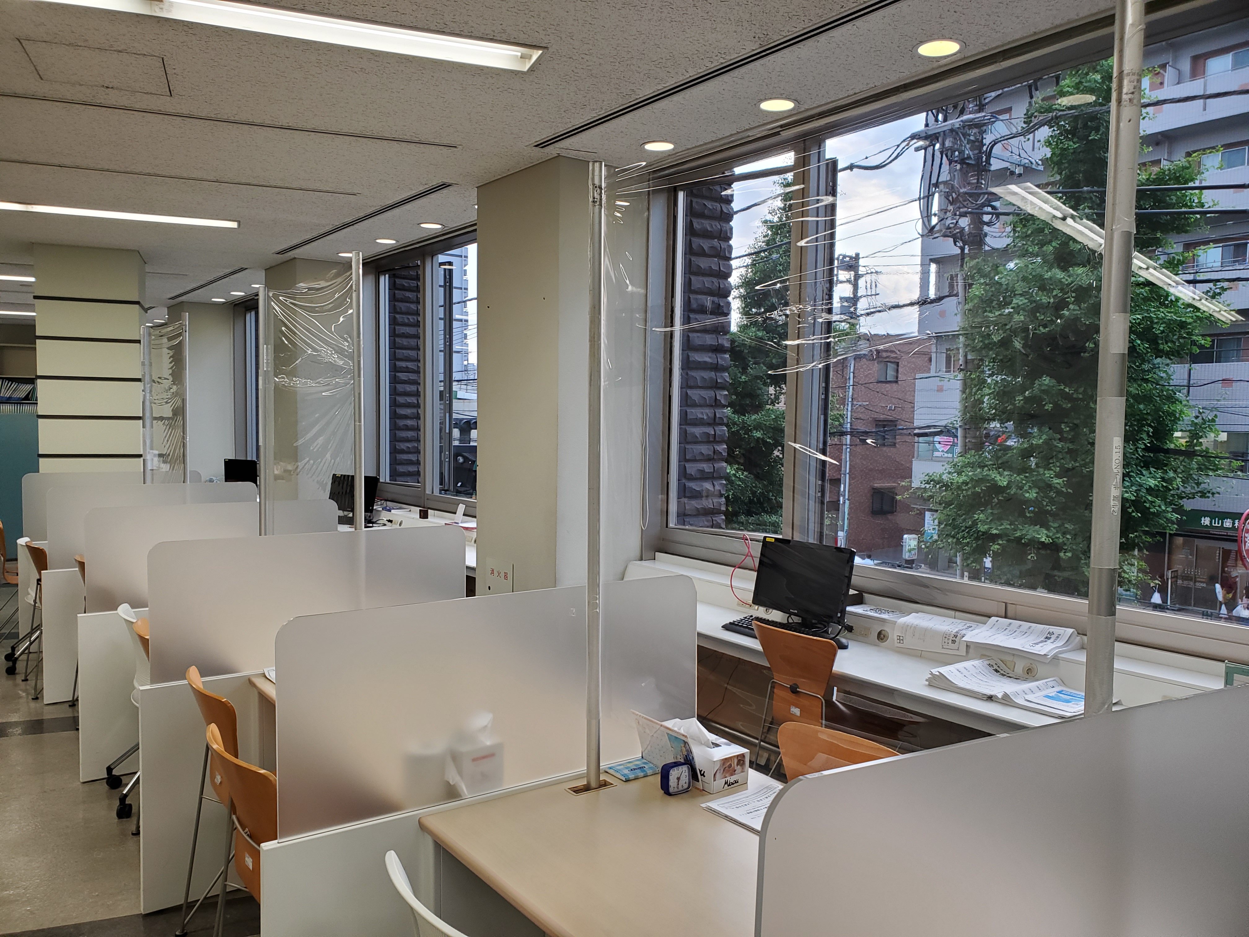 学生対応の際には、コロナウィルス対策(マスクの着用、消毒液の設置、飛沫防止シートの設置等)を