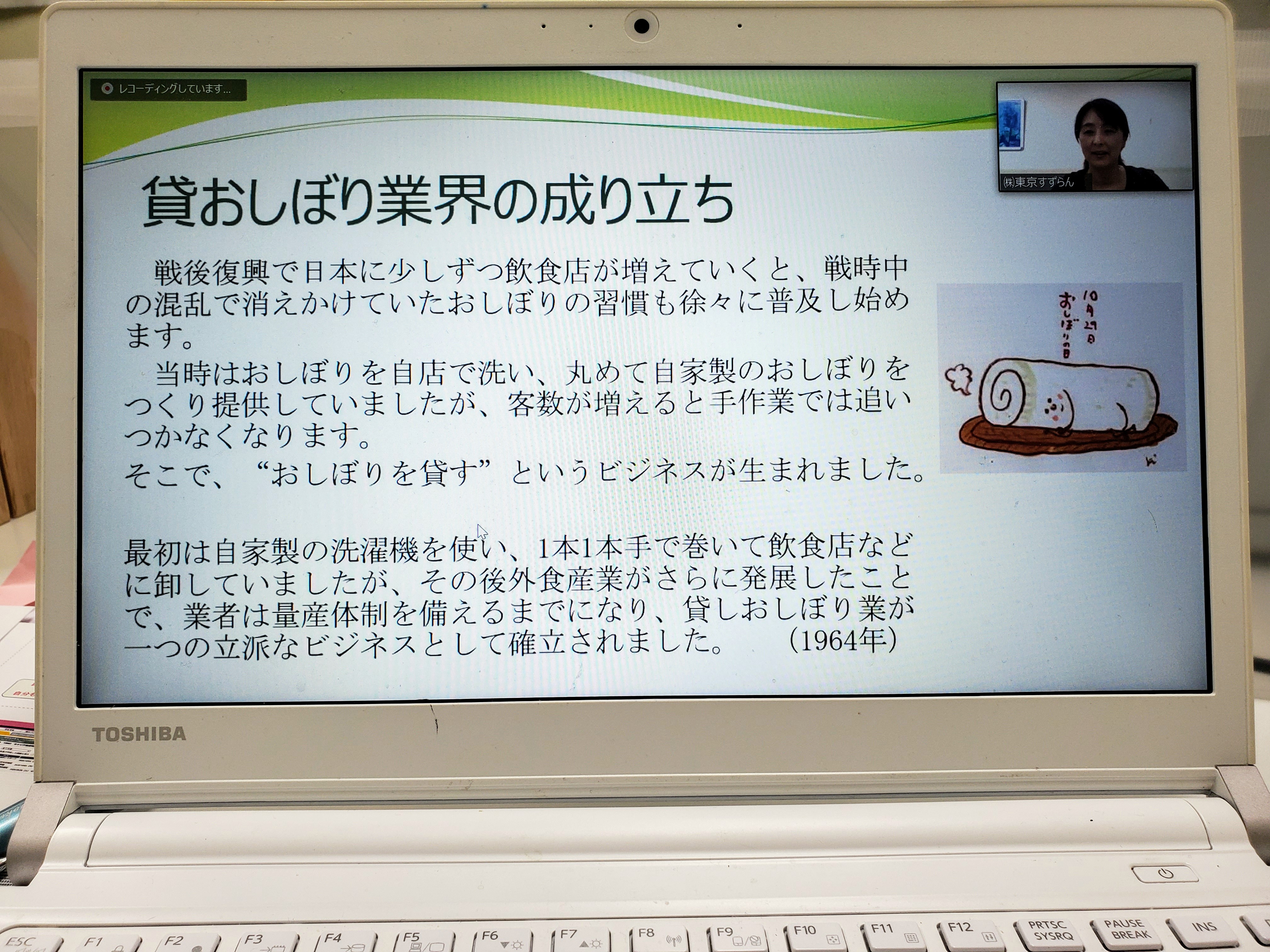 前回に続き積極的に発表する学生が多く、大変有意義な時間となり、「おしぼり屋さん」に興味を持った学生も多くいた100分授業となりました。