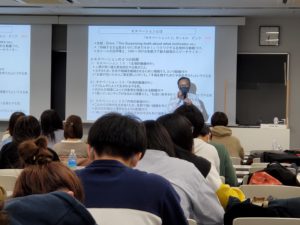 学生は真剣に講師の話しを聞いており、質疑応答において、さらに理解を深めることができた100分授業でした。
