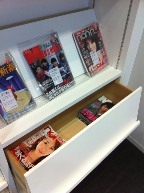 それから、各雑誌の下の引き出しにはバックナンバーも取り揃えてます。「前の号の特集がもう一度見たい!」という場合は、自由に取り出して閲覧してくださいね。ラーニングコモンズ内であればどこで読んでもOKです。ただし、フロア外へは持ち出さないようにご協力お願いします!