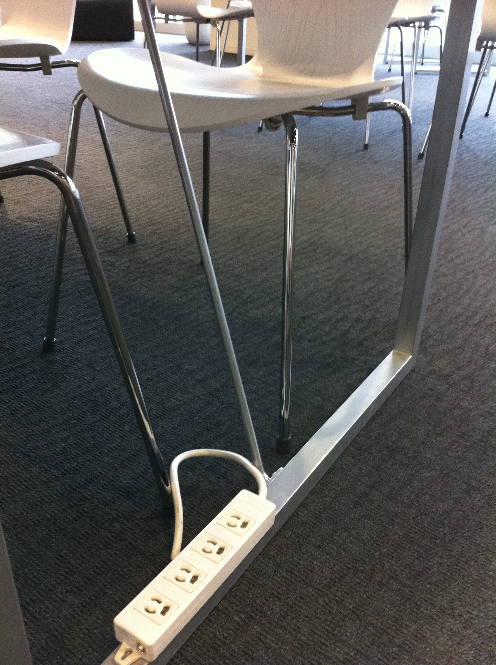 こちらはグループワークエリアのデスクの足元です。こんなところにも電源があるって気づいてましたか?これもマグネット式です。