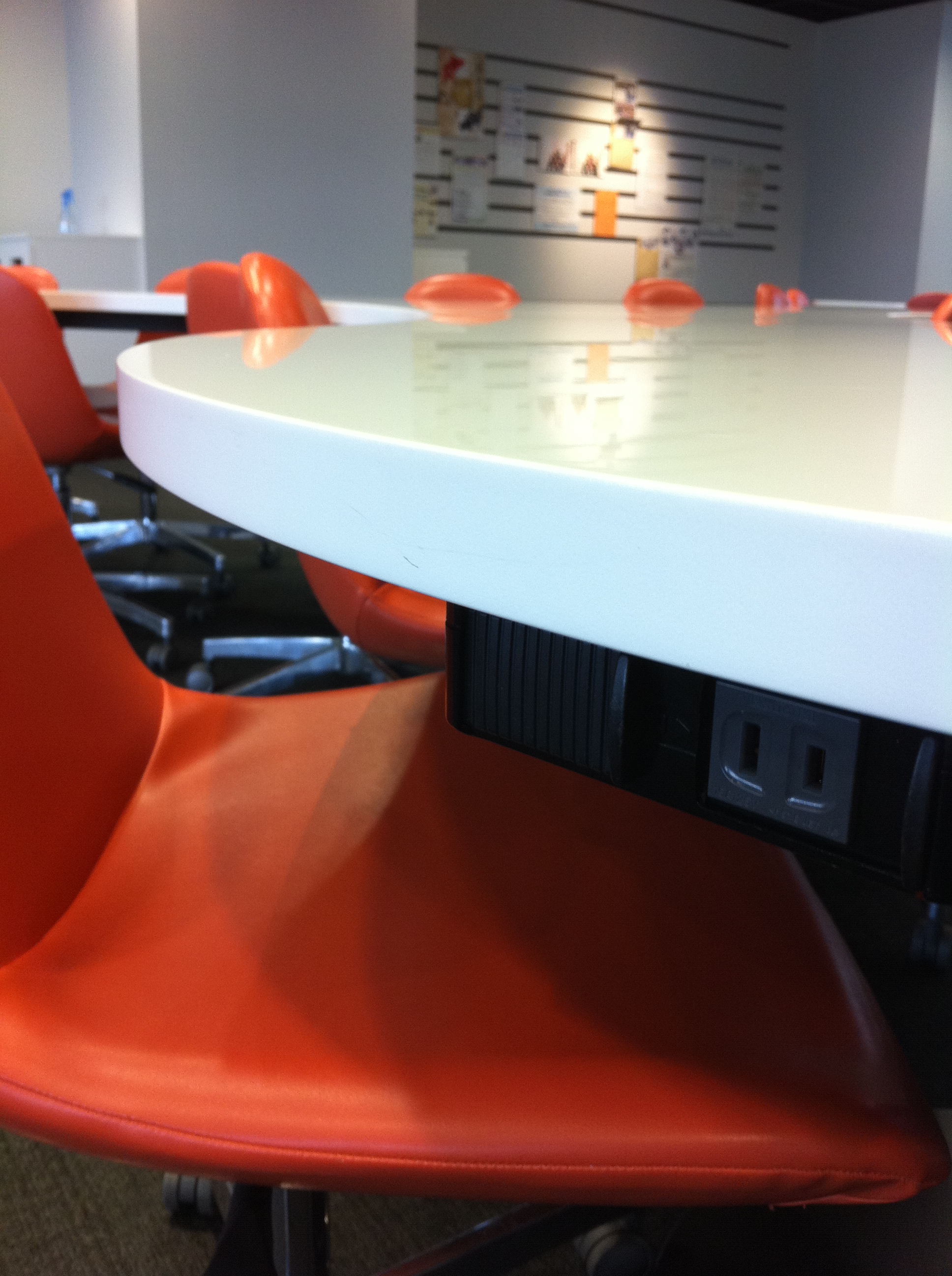 続いてこちらはもうひとつの電源。ミーティングエリアのデスクの天板裏にあります。これが一番気付きにくいかもしれませんね。