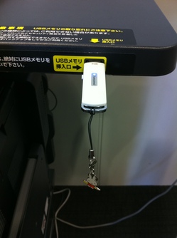 お金またはコピーカードをコピー機にセットして、USBメモリを挿入します(挿入口の上下に注意!)。そうすると、作成したPDF形式のファイルがコピー機に認識されます。あとはディスプレイの指示に従って用紙のサイズや枚数を指定すれば印刷の完了です!
