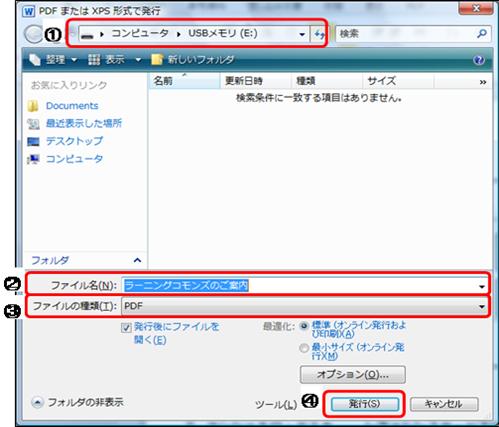 そうすると、[PDFまたはXPS形式で発行]というタイトルの新しいウィンドウが開くので、引き続き以下の作業を行います。