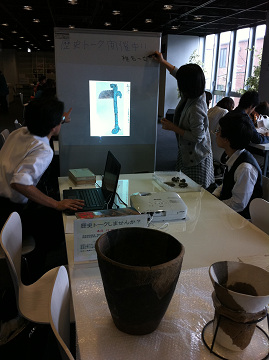 ▲手前に写っているのは図書館からやってきた縄文土器です。迫力満点!