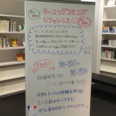 次回の寺山先生によるラーニングコモンズは、「テーマ作り 実践編」として、「しりとり法」「マインドマップ」等、テーマが次々わいてくるトレーニングを参加者のみなさんと「発想法」を実践してみたいと思います。ブログ読者のみなさん、お友達を誘って是非参加してみてください。もちろん次回も、評論系同人誌・ミニコミ誌の読書会タイムを行いますよ。