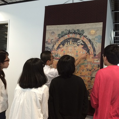 続いて、「熊野観心十界曼荼羅」(くまのかんじんじっかいまんだら)を小林先生に絵解きしていただきました。絵解きとは、仏画などの内容を説明することです。この曼荼羅は、仏教の世界観を老若男女にわかりやすく伝えるためのもので、戦国時代から江戸時代にかけて熊野三山の修営費用を集めるために熊野比丘尼(尼僧)が携行していたそうです。十界が描かれており、それぞれの世界がどのようなものか先生に解説していただきました。十界とは、六道(地獄・餓鬼・畜生・修羅・人・天)に四聖(声聞・縁覚・菩薩・天)を加えたものです。