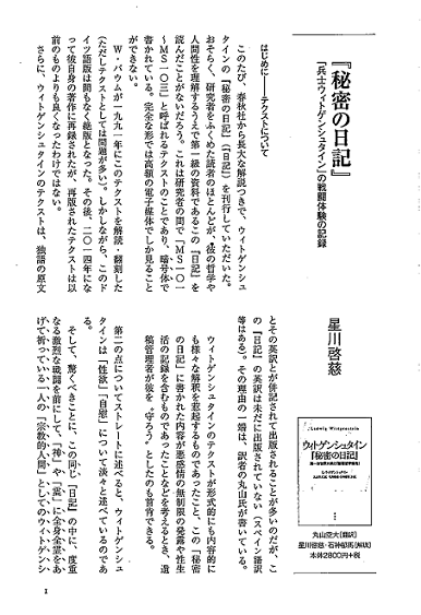 また、星川先生は、春秋社のPR誌『春秋』に「『秘密の日記』「兵士ウィトゲンシュタイン」の戦闘体験の記録」と題する文章を発表しています。これは、『ウィトゲンシュタイン「秘密の日記」――第一次世界大戦と「論理哲学論考」』執筆にまつわる解説となっています。同書と併せて読むことで理解がより深まるのではないでしょうか。