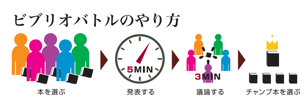 それぞれが自分のオススメの本を持ち寄り、5分間(必ず使い切ります!)で発表を行い、3分間のディスカッションを行います。それを繰り返し、最後に「一番読みたくなった本」に投票してチャンプ本を決めるというものです。
