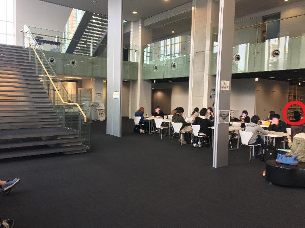 玄関に入って正面階段を上がったところが7号館2階、ラーニングコモンズとなります。