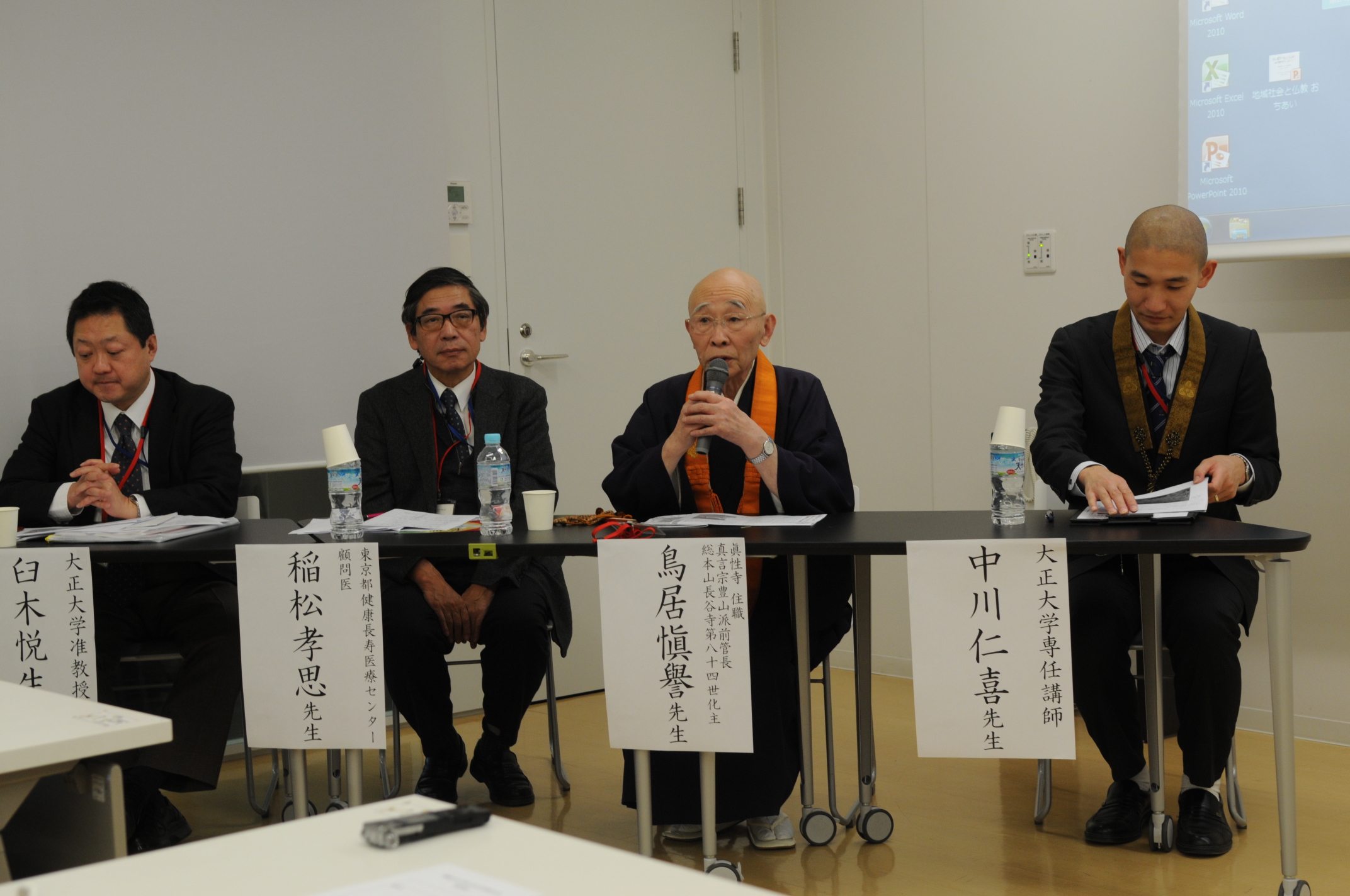 塩入法道先生(大正大学図書館長・大正大学教授)、落合崇志先生(大正大学教授)をコーディネーターに、中川仁喜先生(大正大学専任講師) 、鳥居愼譽先生(眞性寺 住職・真言宗豊山派前管長・総本山長谷寺第八十四世化主)、稲松孝思先生(東京都健康長寿医療センター顧問医) 、臼木悦生先生(大正大学准教授)を講師として、専門分野からのご発表をいただき、その後、会場からの質疑応答も交えてディスカッションを行いました。
