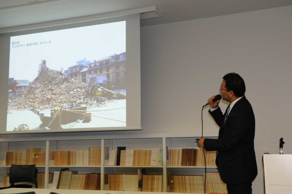 今回は、スダン・シャキャ先生より、大震災から間もなく一年を迎えようとするネパールの現状について、様々な場所の記録写真を交えてご報告いただきました。