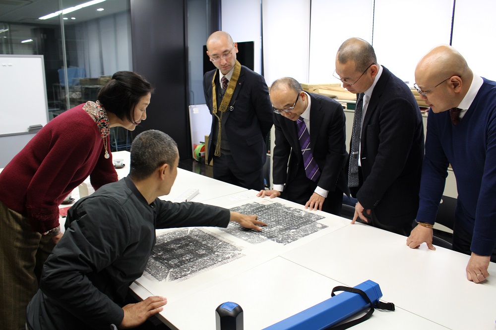 同席した綜合仏教研究所の種村隆元所長と密教学を専門とする佐々木大樹専任講師たちは拓本を食い入るように見ていました。