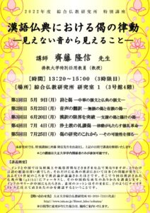 綜合仏教研究所では、2022年度春学期に佛教大学特別任用教員(教授)の齊藤隆信先生を特別講師にお迎えし、全5回の特別講座を開催いたしました(*参加は学内関係者のみに限定)。