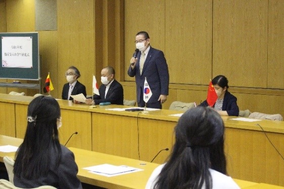 高橋学長を始め、国際交流に携わる多くの先生方を目の前にして、留学生は緊張の面持ちで式が開始しましたが、先生方から応援のメッセージをいただき、これから始まる留学生活にドキドキしながらも、期待で胸を膨らませている様子でした。