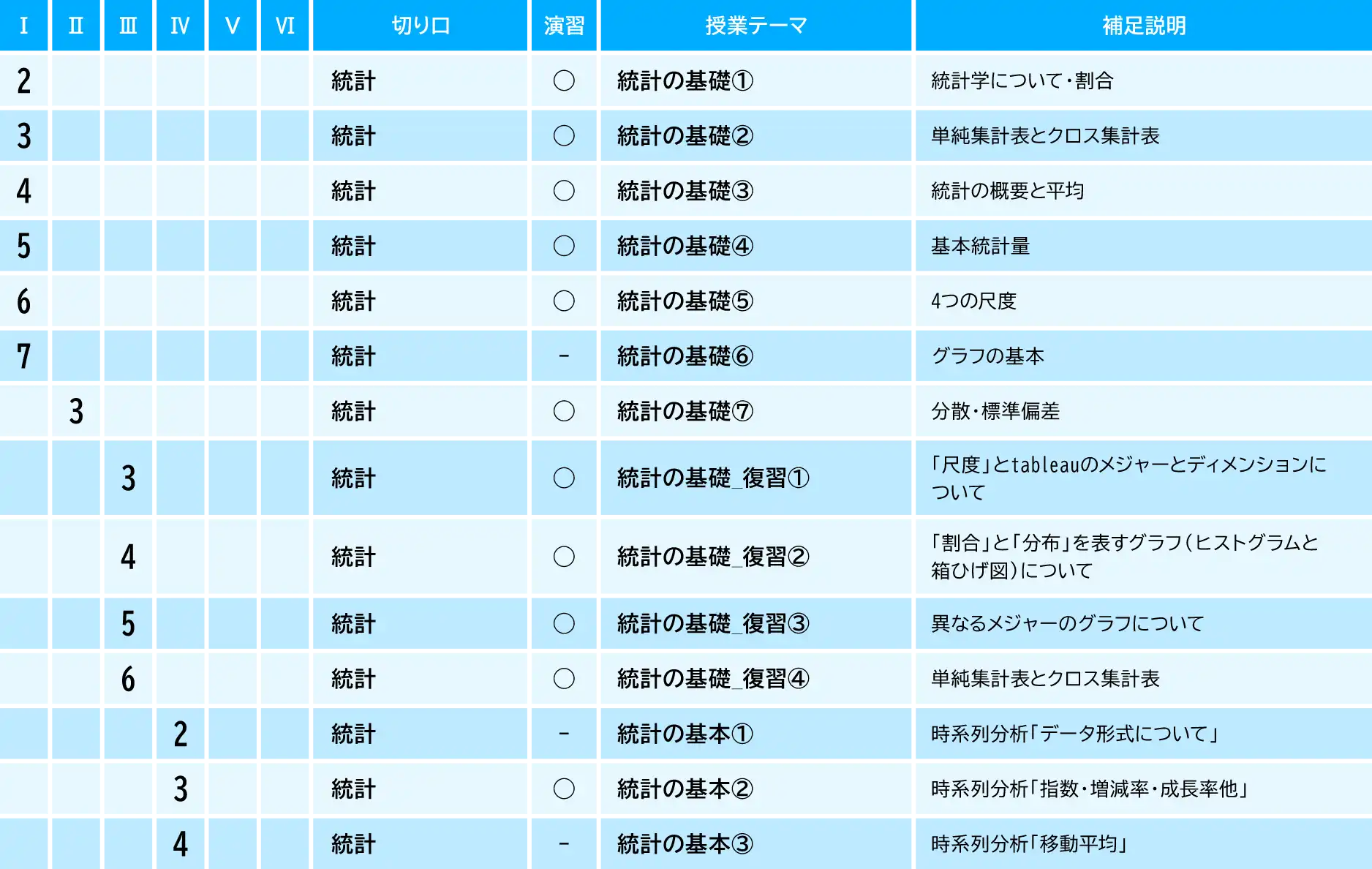 ①統計の基本に基づき ②データを使った課題解決の基本的なステップ ③定量分析手法 ④情報リテラシーと情報倫理(守秘義務契約)を学んでいく。