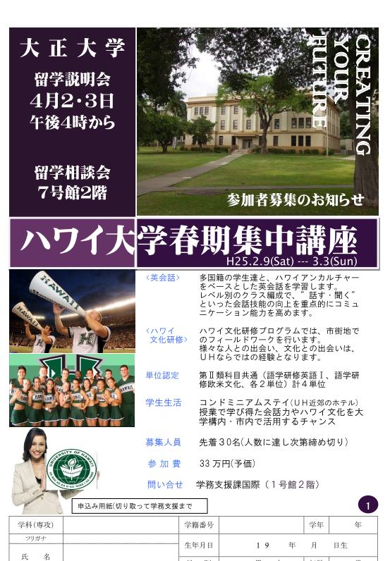 H25 ハワイ大学マノア校春期集中講座参加募集のお知らせ