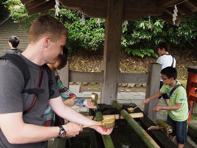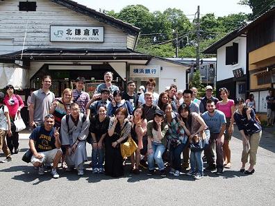 参加者の日本人の学生がリーダーになり、総勢28名のグループが北鎌倉を10時15分にスタートしました。明月院の庭の美しさを堪能し、鶴岡八幡宮に着いたときは、グループ同志、なにか不思議なつながりが芽生えていました。「一庵」で日本そばをいただき、江ノ電に乗り(混んでいた)長谷寺で湘南の海岸を見て一気に元気になり、鎌倉大仏で騒ぎつ疲れ一日を終えました。