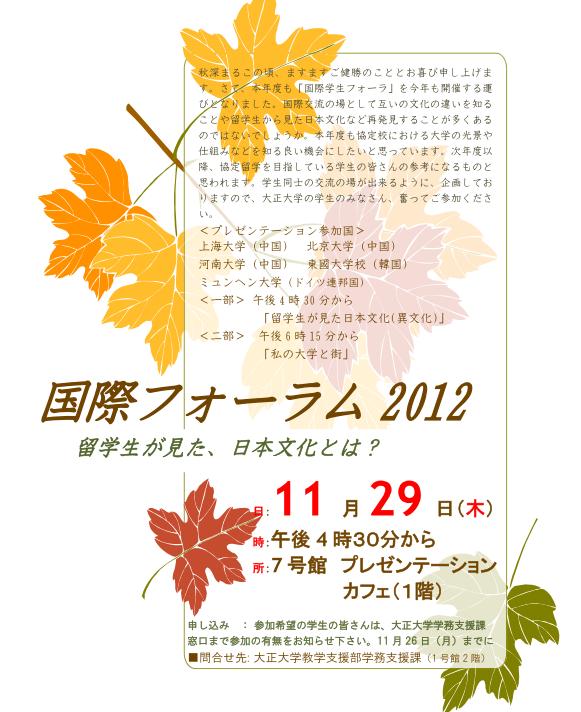 秋深まるこの頃、ますますご健勝のこととお喜び申し上げます。さて、本年度も「国際学生フォーラ」を今年も開催する運びとなりました。国際交流の場として互いの文化の違いを知ることや留学生から見た日本文化など再発見することが多くあるのではないでしょうか。本年度も協定校における大学の光景や仕組みなどを知る良い機会にしたいと思っています。次年度以降、協定留学を目指している学生の皆さんの参考になるものと思われます。学生同士の交流の場が出来るように、企画しておりますので、大正大学の学生のみなさん、奮ってご参加ください。