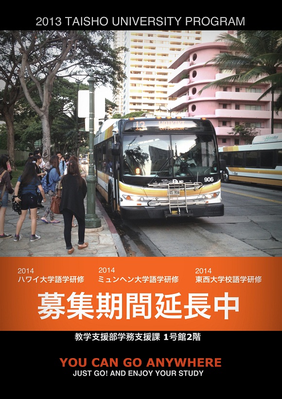 みなさん、こんにちは。暑い夏をまえにして勉強、そして、大学生活を計画的に過ごしていますか。夏を制する者はなんとやらで、この夏休みをどのように過ごすかで、一年が決まってしまうこともあります。この語学研修も、まだ6か月も先の話なので「応募する」「応募するのやめる」などと思っていませんか。大学生活の中で、何をするか?何をしたかで、今後の学校生活も変わってきます。積極的に、海外へ出てみませんか。大正大学が送り出す各種、語学研修はの応募期間をただ今、延長しています。どの研修も、充実した内容ですので、みなさんの応募をお待ちしています。学務支援課国際 1号館2階までおいでください。