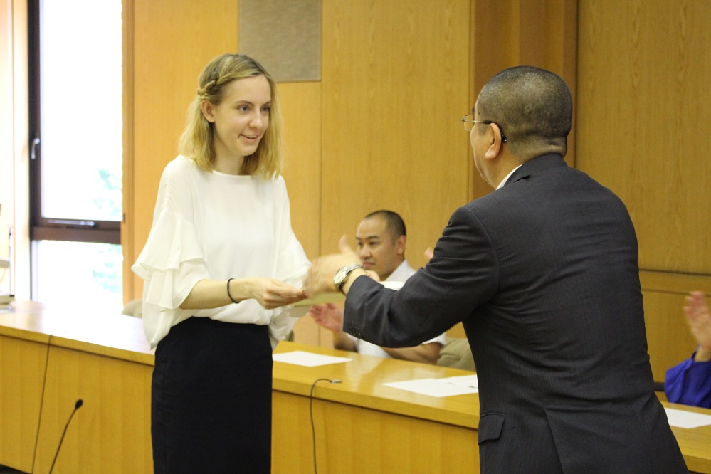 また、修了式では本学課程のプログラムを修了したミュンヘン大学、上海大学、河南大学、東國大学校からの協定留学生9名に大塚学長より修了証が授与されました。