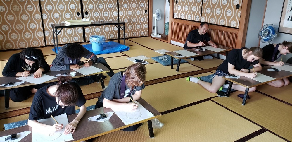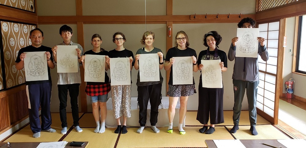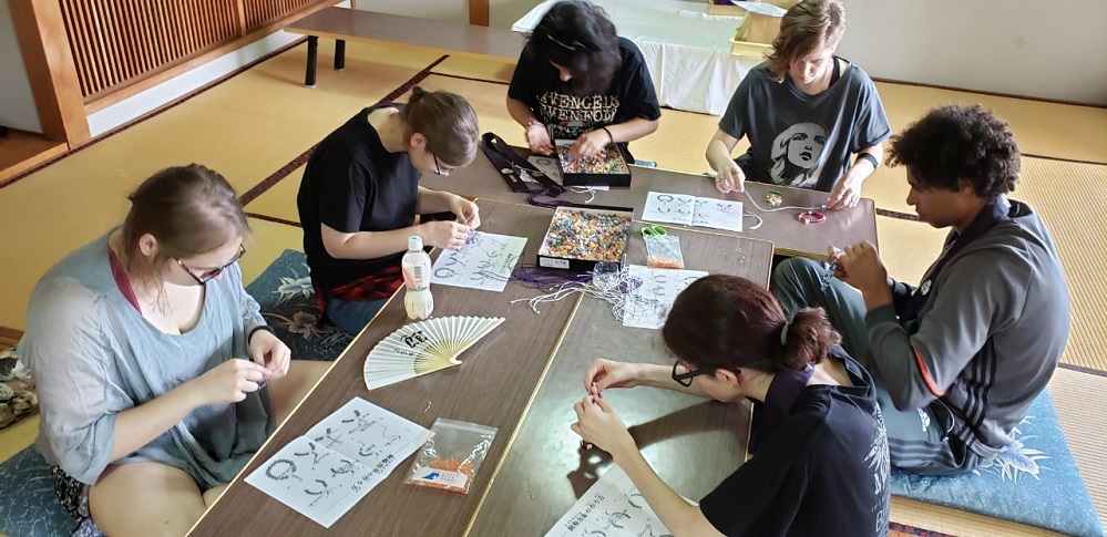2日目には、写仏や腕輪念珠作りを体験しました。留学生にとってはどちらも初めての経験でしたが、それぞれ集中して取り組んでいる様子でした。特に腕輪念珠作りが好評で、腕輪念珠を複数個作り、研修外でも身に付けている留学生が多かったです。