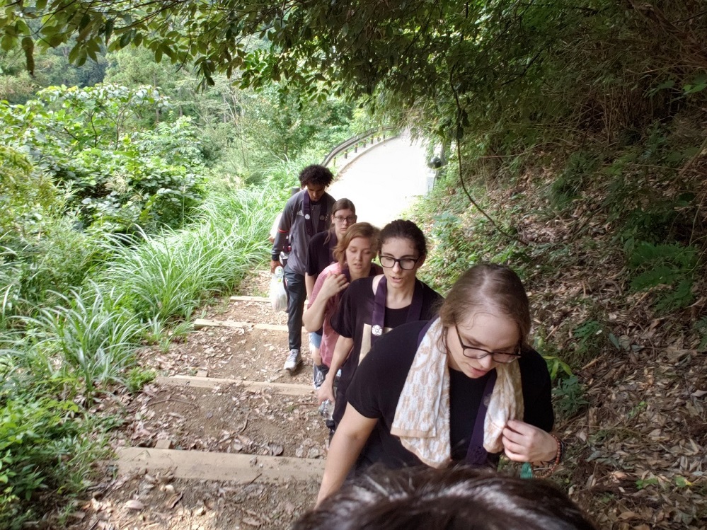 9月11日、12日の一泊二日で高尾山での仏教研修が行われました。初日は早朝より山頂を目指して高尾山麓を出発しました。滝行を経験する予定でしたが、数日前に来た台風の影響で、滝へと続く道が封鎖されてしまい、残念ながら滝行を行うことはできませんでした。