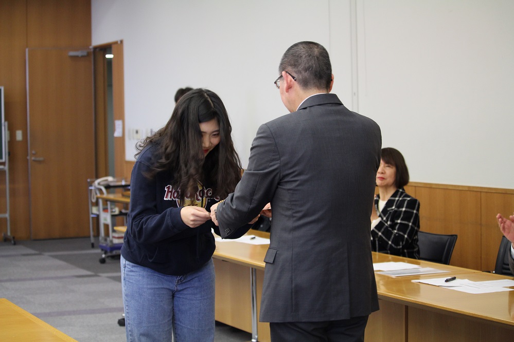 修了証授与 髙橋学長より 留学生代表イム・ジフさんより