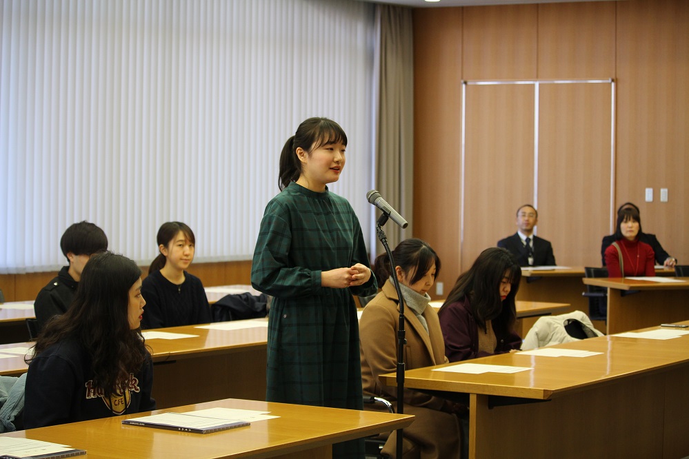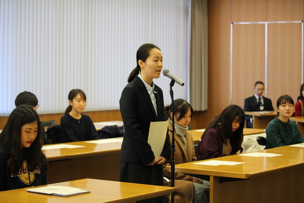 留学生代表イム・ジフさんよりご挨拶いただき、茶道部での活動や日本人学生とともに鎌倉を巡った鎌倉研修など、様々貴重な経験ができたとお話しいただきました。自国の大学卒業後、日本での就職を考えている学生もいます。大正大学での経験を活かして日本と韓国の架け橋となるような存在になることを願っています。