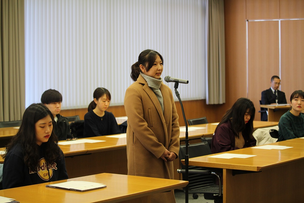 また、2月末より東國大学校(韓国)にて1年間の留学がスタートする佐々木萌衣さん(地域創生学科)、鈴木紀尋さん(表現文化学科)の出発式が行われました。大正大学の代表として臨む協定留学に対する期待や抱負を佐々木さんよりお話しいただき、髙橋学長を始め、国際交流委員会の先生方より激励のお言葉をいただきました。現地学生との交流や異文化体験等を通して、充実した留学生活となりますように!