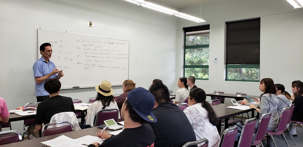 平日は、英語コミュニケーションを中心とするクラスが行われるほか、ハワイの文化を学ぶワークショップやハワイ大学の学生と交流を楽しむインターチェンジの時間も設けられました。また、本学と関係の深い宗教学部の教授による特別講義も行われ、仏教がハワイ日系移民に与えた影響について学びました。