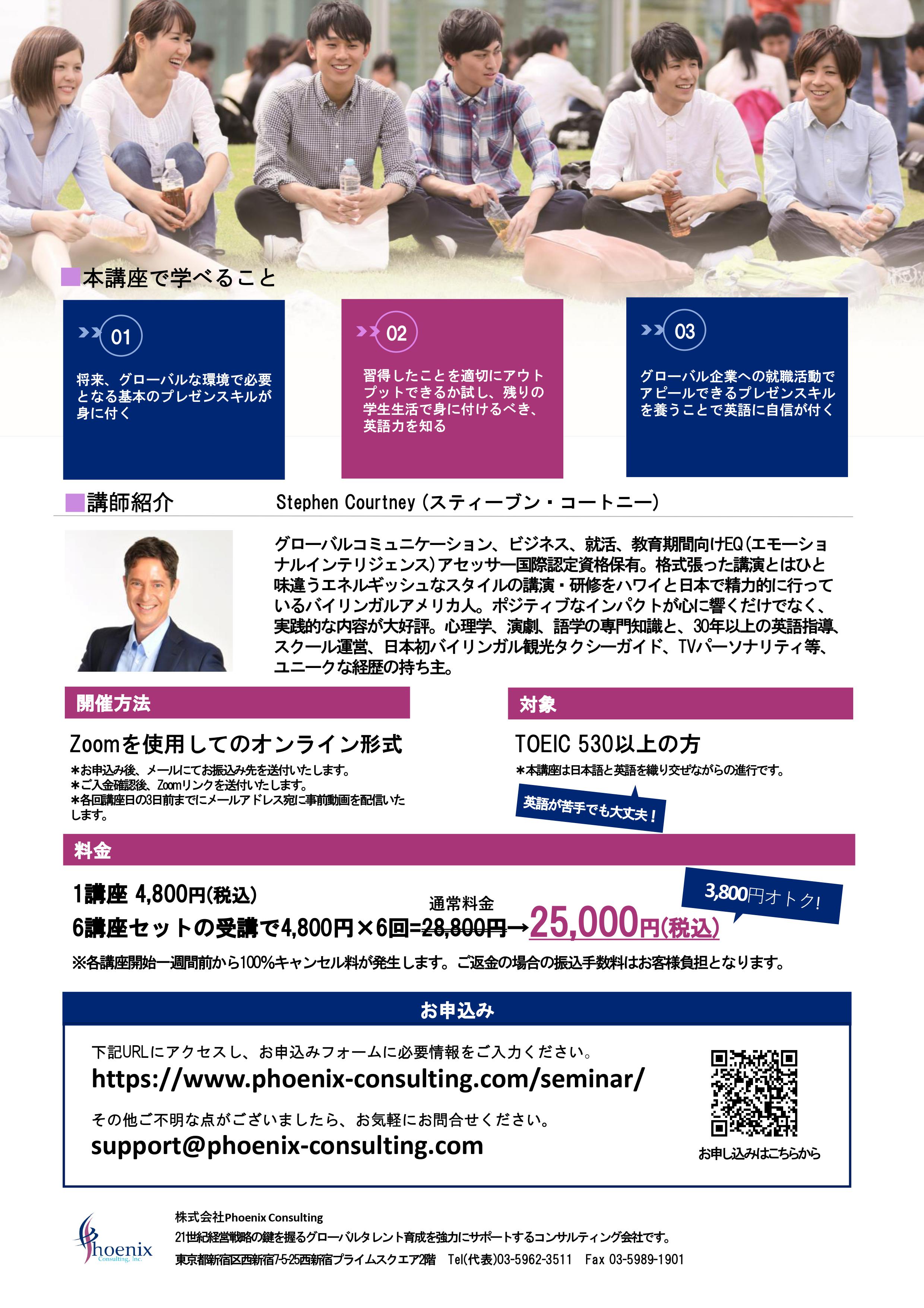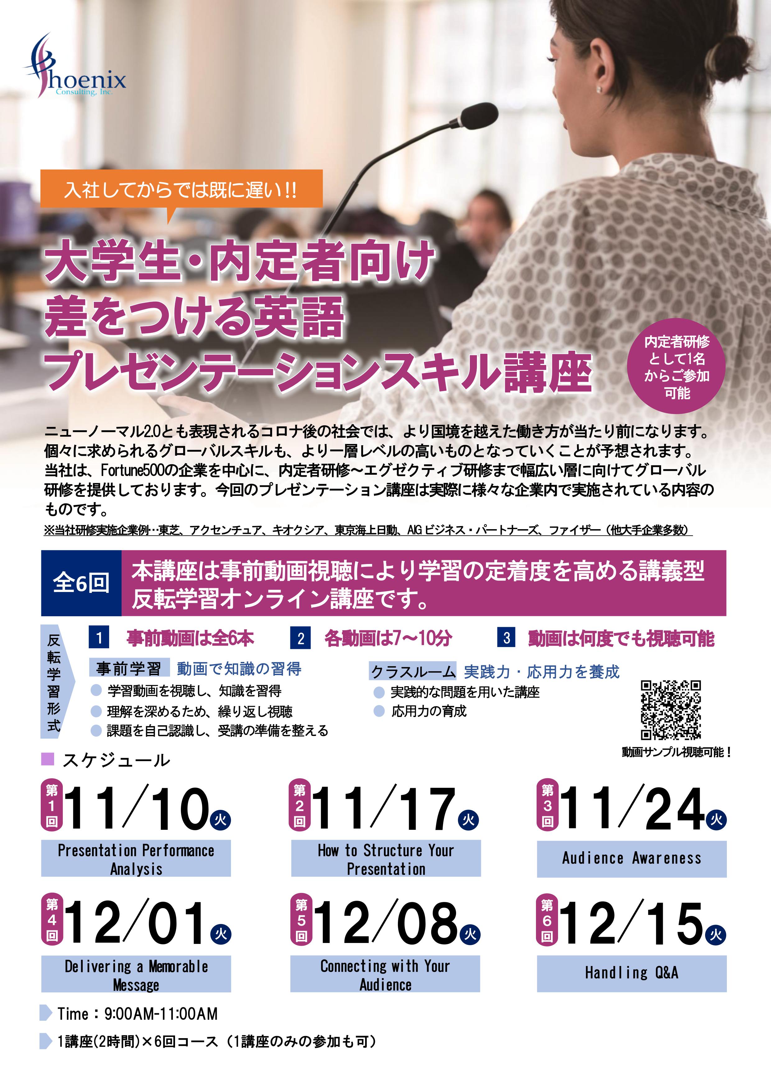 株式会社フェニックスコンサルティングは、Fortune500の企業を中心に、内定者研修~エグゼクティブ研修まで幅広い層に向けてグローバル研修を提供しております。今回ご紹介させていただくプレゼンテーション講座は実際に様々な企業内で実施されている内容のものです。大学生、または内定者の方に、社会人になる前に知っていただきたい内容を6回研修に凝縮して提供いたします。