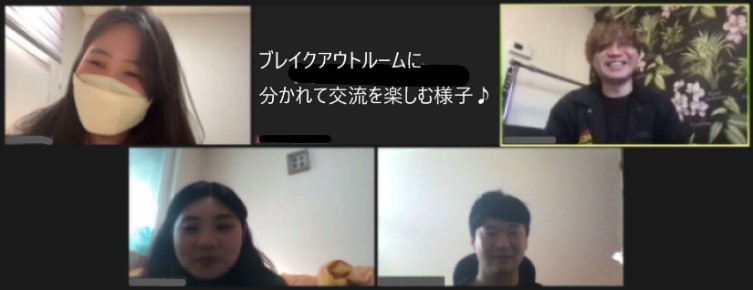 また、週2回で行われた学生交流では、少人数のブレイクアウトルームに分かれて、お互いの文化や学生生活などについてお話ししました!