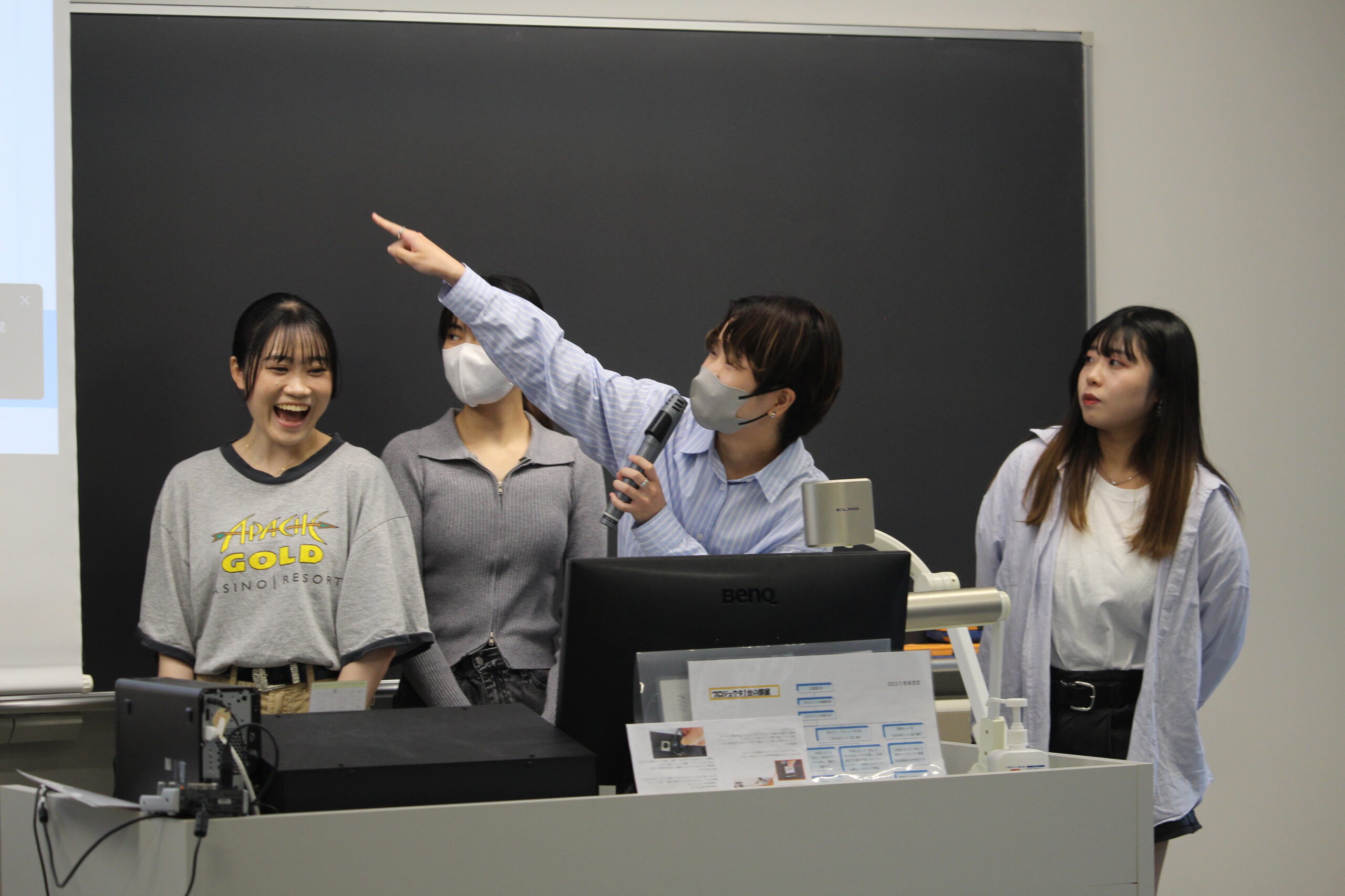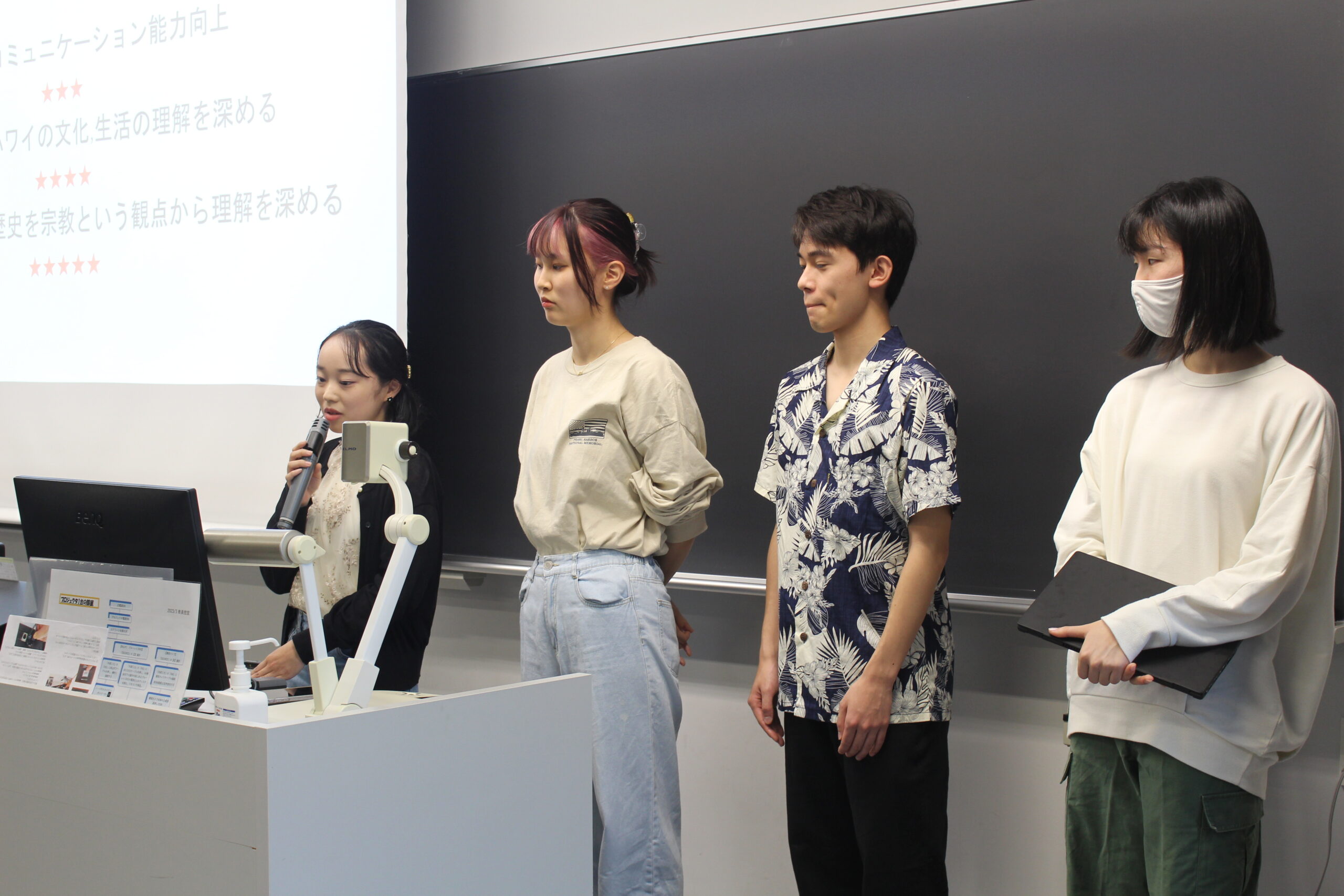 海外文化・語学研修成果報告会ではアメリカ・ハワイ大学研修チームは2つのグループに分かれ、伝えたいことを汲み取ってコミュニケーションをとってくれたと現地の人々の温かさや、日系移民について学びを深めることができたと報告しました。