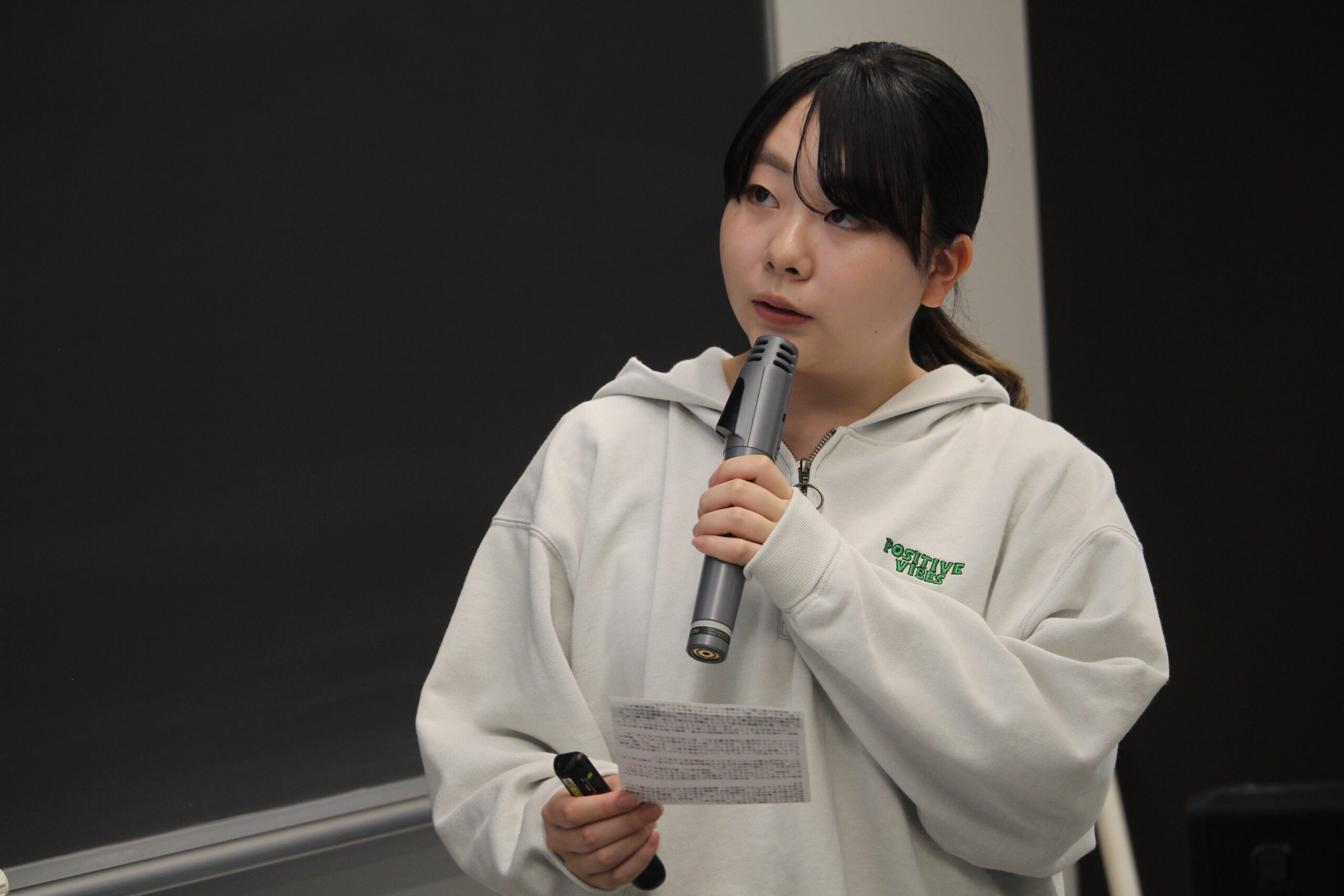 韓国・東国大学校への協定留学経験を報告した鈴木さんは、異文化間の交流を通じて柔軟な考え方と適応力を身につけたと述べ、卒業制作への活かし方も意欲的に語りました。