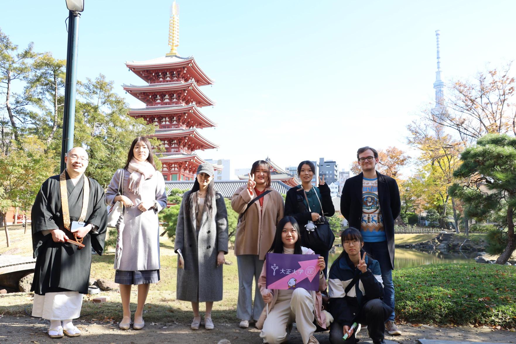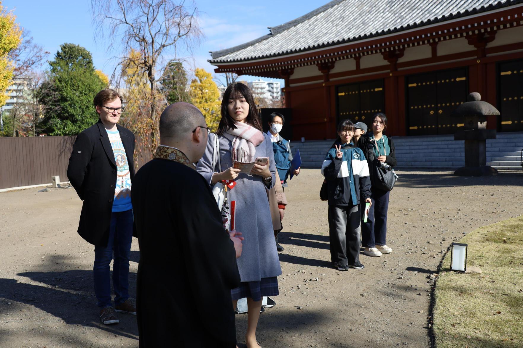 協定留学生の日本文化研修および学生交流の一環として、浅草周辺の散策と浅草寺参拝を実施しました。当日は、浅草寺山内・寿命院の壬生真紹様にご案内いただき、五重塔内の絵馬堂や伝法院庭園など、通常はなかなか拝観の機会が限られる貴重な場所を見学させていただきました。
